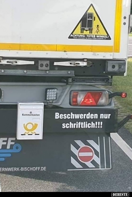 ACHTUNG: TOTER WINKEL... bisschen zynisch... Soll er sich doch nen Zusatz-Spiegel anbauen statt das Schild hin zu kleben - dann ist da auch kein Toter-Winkel mehr... Die Denkart mancher ist echt erstaunlich.