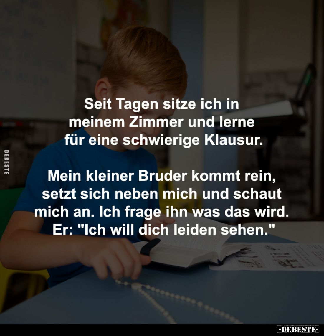 Seit Tagen sitze ich in meinem Zimmer und lerne für eine schwierige Klausur. Mein kleiner Bruder kommt rein, setzt sich neben mich und schaut mich an. Ich frage ihn was das wird. Er: "Ich will dich leiden sehen." Kommentar (0) | tags: #zimmer #bruder
