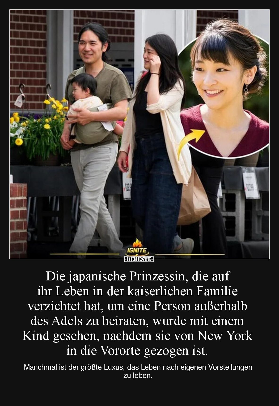 Die japanische Prinzessin, die auf ihr Leben in der kaiserlichen Familie verzichtet hat, um eine Person außerhalb des Adels zu heiraten, wurde mit einem Kind gesehen, nachdem sie von New York in die Vororte gezogen ist. Manchmal ist der größte Luxus, das Leben nach eigenen Vorstellungen zu leben. Kommentar (0) | tags: