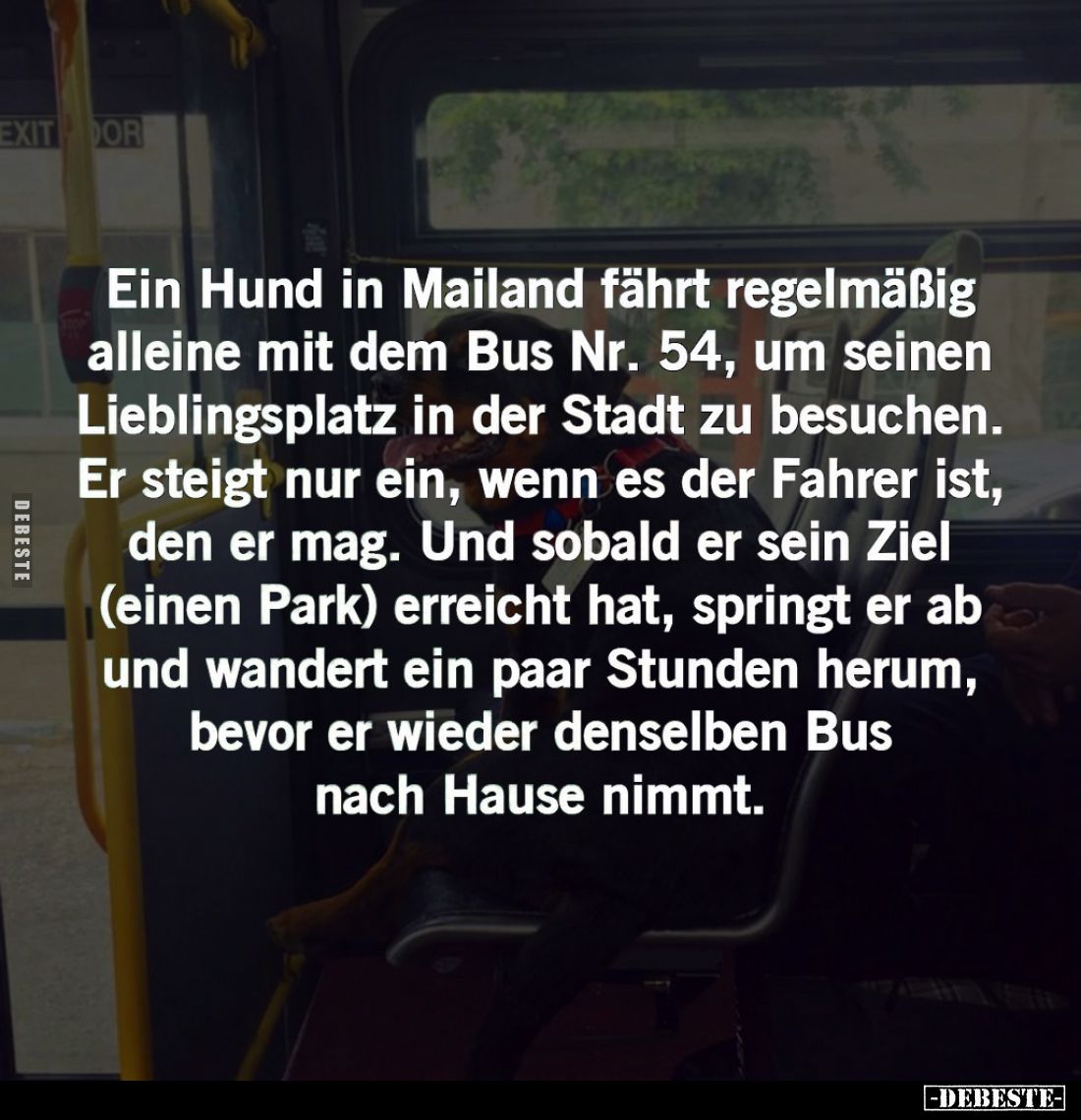 Ein Hund in Mailand fährt regelmäßig alleine mit dem Bus Nr. 54, um seinen Lieblingsplatz in der Stadt zu besuchen. Er steigt nur ein, wenn es der Fahrer ist, den er mag. Und sobald er sein Ziel (einen Park) erreicht hat, springt er ab und wandert ein paar Stunden herum, bevor er wieder denselben Bus nach Hause nimmt. Kommentar (1) | tags: #hund #wenn