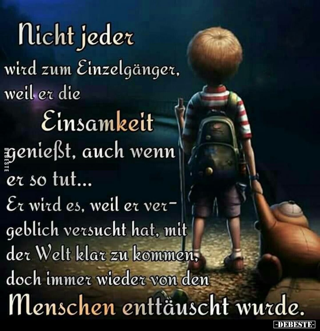 Nicht jeder wird zum Einzelgänger, weil er die Einsamkeit genießt, auch wenn er so tut... Er wird es, weil er vergeblich versucht hat, mit der Welt klar zu kommen, doch immer wieder von den Menschen enttäuscht wurde. Kommentar (0) | tags:
