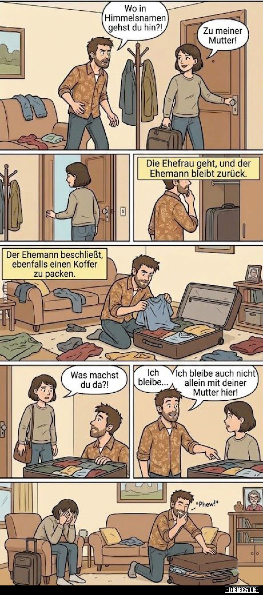 Wo in Himmelsnamen gehst du hin?! - Zu meiner Mutter! - Die Ehefrau geht, und der Ehemann bleibt zurück. - Der Ehemann beschließt, ebenfalls einen Koffer zu packen. - Was machst du da?! - Ich bleibe... Ich bleibe auch nicht allein mit deiner Mutter hier! Kommentar (0) | tags: #ehefrau #ehemann #koffer