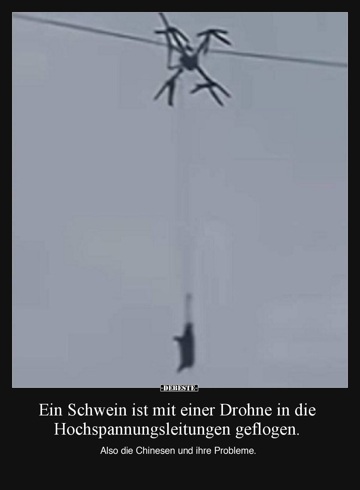 Ein Schwein ist mit einer Drohne in die Hochspannungsleitungen geflogen. Also die Chinesen und ihre Probleme. Kommentar (0) | tags: