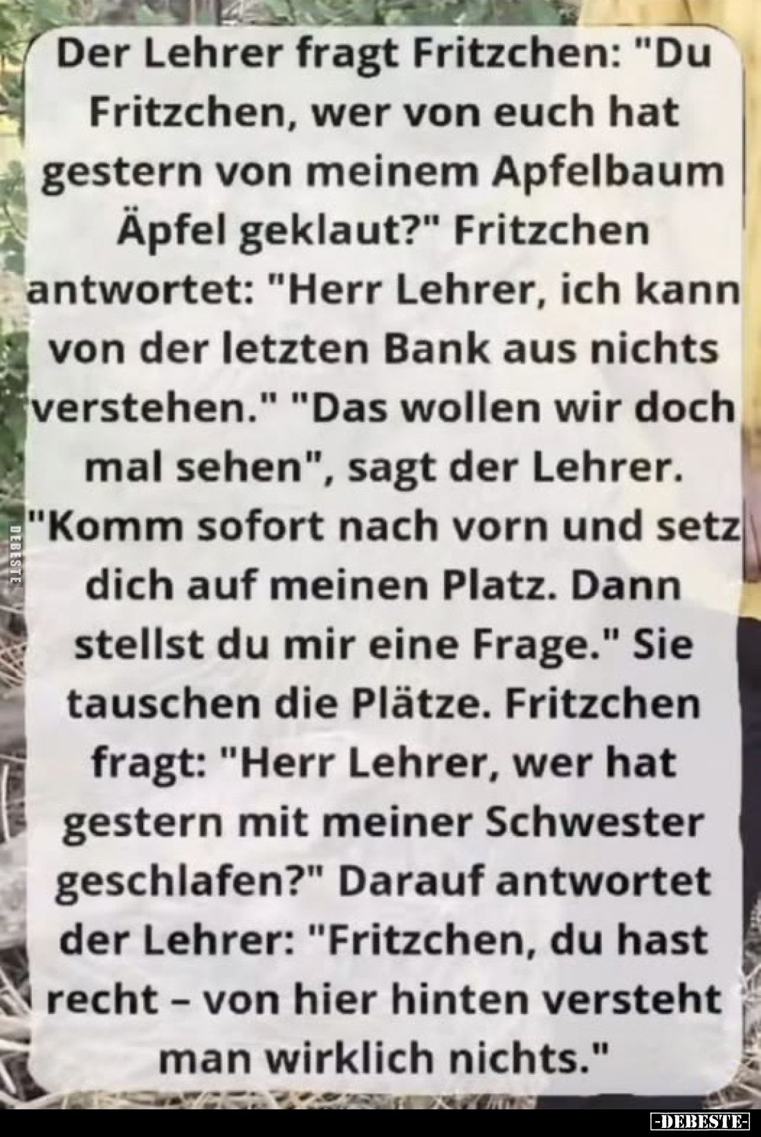 Der Lehrer fragt Fritzchen: "Du Fritzchen, wer von euch hat gestern von meinem Apfelbaum Äpfel geklaut?" Fritzchen antwortet: "Herr Lehrer, ich kann von der letzten Bank aus nichts verstehen." "Das wollen wir doch mal sehen", sagt der Lehrer. "Komm sofort nach vorn und setz dich auf meinen Platz. Dann stellst du mir eine Frage." Sie tauschen die Plätze. Fritzchen fragt: "Herr Lehrer, wer hat gestern mit meiner Schwester geschlafen?" Darauf antwortet der Lehrer: "Fritzchen, du hast recht - von hier hinten versteht man wirklich nichts." Kommentar (0) | tags: #lehrer #bank
