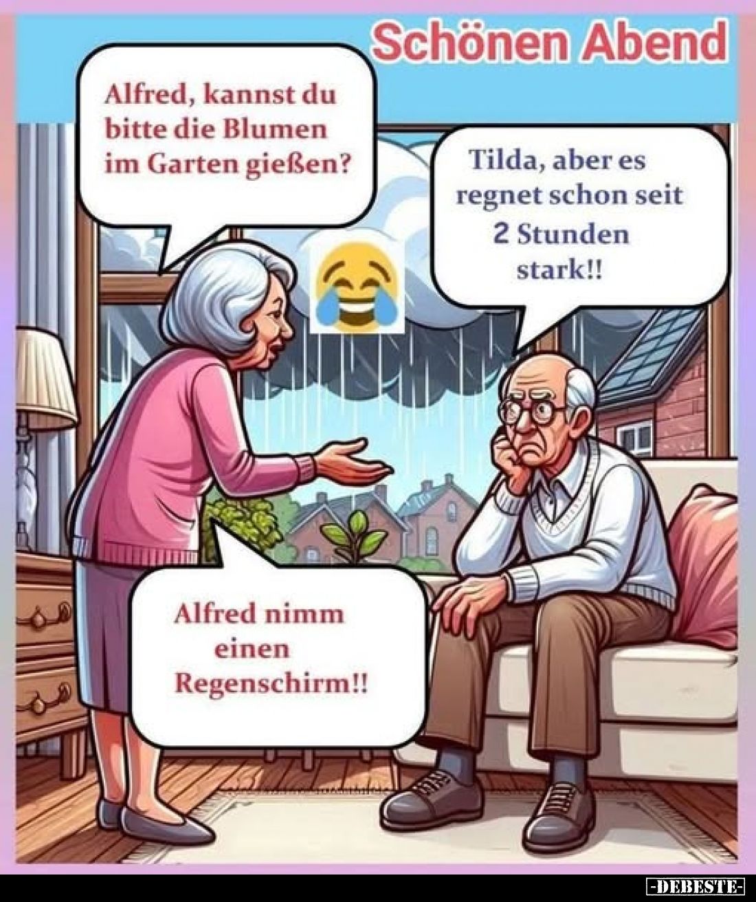 Schönen Abend - Alfred, kannst du bitte die Blumen im Garten gießen? - Tilda, aber es regnet schon seit 2 Stunden stark!! - Alfred nimm einen Regenschirm!! Kommentar (0) | tags: #schönen abend #abend #bitte #blumen #garten #es regnet #regenschirm