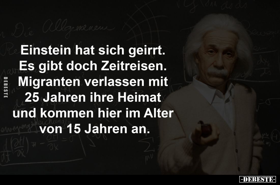 Einstein hat sich geirrt. Es gibt doch Zeitreisen. Migranten verlassen mit 25 Jahren ihre Heimat und kommen hier im Alter von 15 Jahren an. Kommentar (0) | tags: #doch #migranten #kommen #alter #im alter