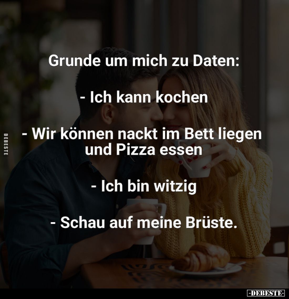 Grunde um mich zu Daten: - Ich kann kochen - Wir können nackt im Bett liegen und Pizza essen - Ich bin witzig - Schau auf meine Brüste. Kommentar (0) | tags: #kochen #im bett liegen #bett #im bett #pizza #pizza essen #essen #witzig