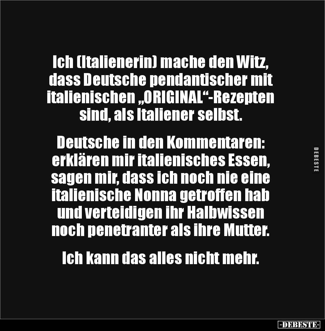 Ich (Italienerin) mache den Witz, dass Deutsche pendantischer mit italienischen „ORIGINAL“-Rezepten sind, als Italiener selbst. Deutsche in den Kommentaren: erklären mir italienisches Essen, sagen mir, dass ich noch nie eine italienische Nonna getroffen hab und verteidigen ihr Halbwissen noch penetranter als ihre Mutter. Ich kann das alles nicht mehr. Kommentar (0) | tags: