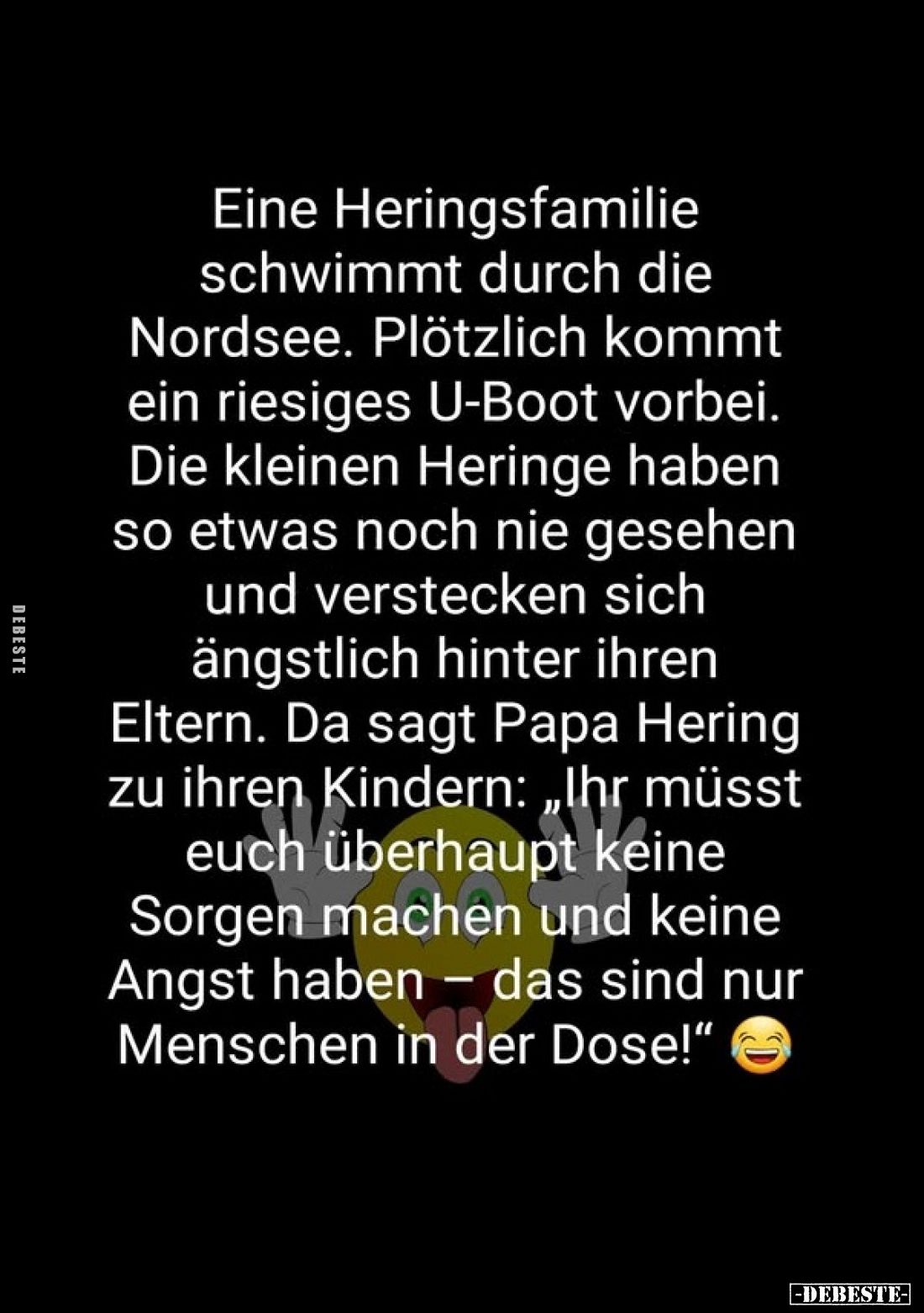 Eine Heringsfamilie schwimmt durch die Nordsee. Plötzlich kommt ein riesiges U-Boot vorbei. Die kleinen Heringe haben so etwas noch nie gesehen und verstecken sich ängstlich hinter ihren Eltern. Da sagt Papa Hering zu ihren Kindern: „Ihr müsst euch überhaupt keine Sorgen machen und keine Angst haben – das sind nur Menschen in der Dose!" Kommentar (0) | tags: #nordsee #eltern