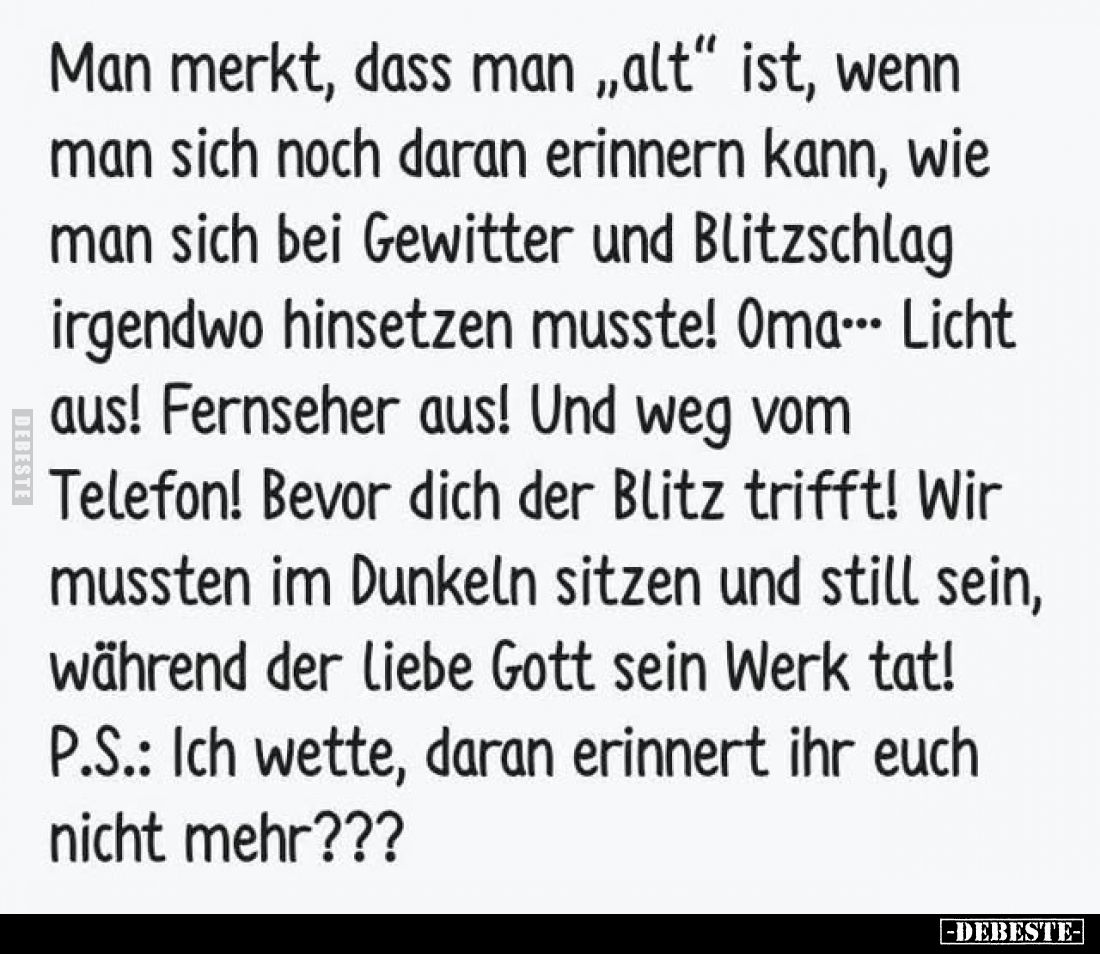 Man merkt, dass man "alt" ist, wenn man sich noch daran erinnern kann, wie man sich bei Gewitter und Blitzschlag irgendwo hinsetzen musste! Oma... Licht aus! Fernseher aus! Und weg vom Telefon! Bevor dich der Blitz trifft! Wir mussten im Dunkeln sitzen und still sein, während der liebe Gott sein Werk tat! P.S. Ich wette, daran erinnert ihr euch nicht mehr??? Kommentar (0) | tags: #wenn #gewitter #licht aus #fernseher
