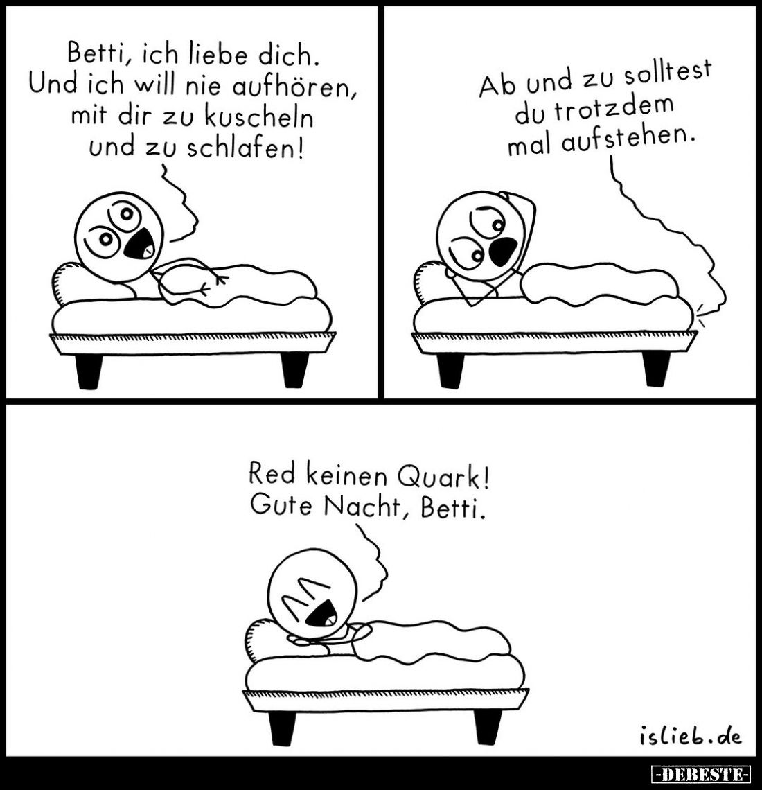 Betti, ich liebe dich. Und ich will nie aufhören, mit dir zu kuscheln und zu schlafen! - Ab und zu solltest du trotzdem mal aufstehen. - Red keinen Quark! Gute Nacht, Betti. Kommentar (0) | tags: #ich liebe dich #liebe #liebe dich #kuscheln #schlafen #aufstehen #quark #gute nacht #nacht