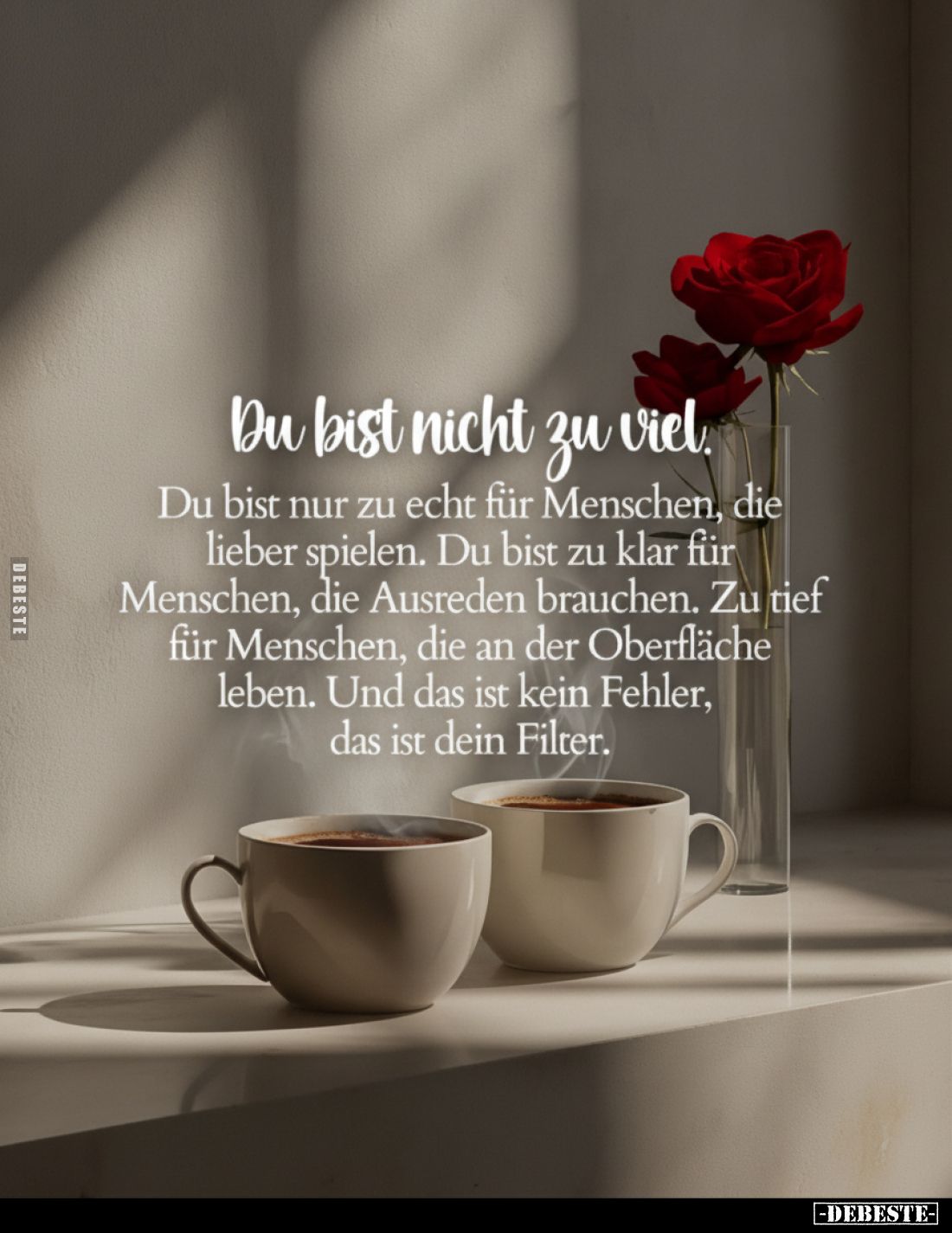 Du bist nicht zu viel. Du bist nur zu echt für Menschen, die lieber spielen. Du bist zu klar für Menschen, die Ausreden brauchen. Zu tief für Menschen, die an der Oberfläche leben. Und das ist kein Fehler, das ist dein Filter. Kommentar (0) | tags: