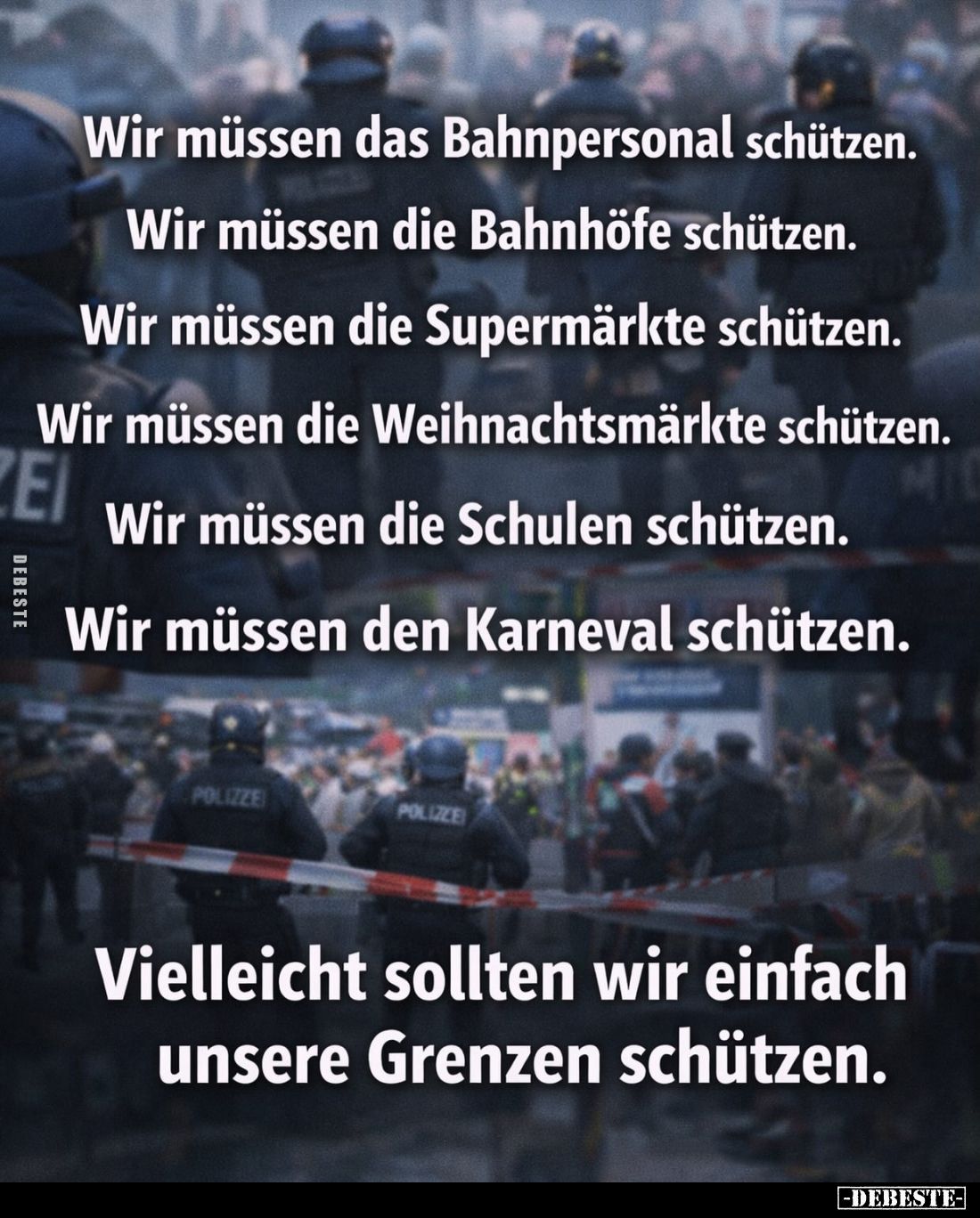 Wir müssen das Bahnpersonal schützen. Wir müssen die Bahnhöfe schützen. Wir müssen die Supermärkte schützen. Wir müssen die Weihnachtsmärkte schützen. Wir müssen die Schulen schützen. Wir müssen den Karneval schützen. Vielleicht sollten wir einfach unsere Grenzen schützen. Kommentar (0) | tags: