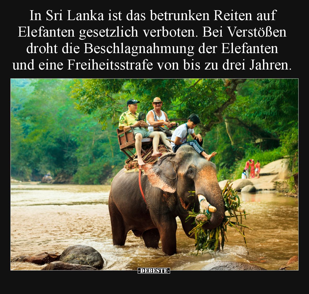 In Sri Lanka ist das betrunken Reiten auf Elefanten gesetzlich verboten. Bei Verstößen droht die Beschlagnahmung der Elefanten und eine Freiheitsstrafe von bis zu drei Jahren. Kommentar (0) | tags: #sri lanka #betrunken #reiten #elefanten