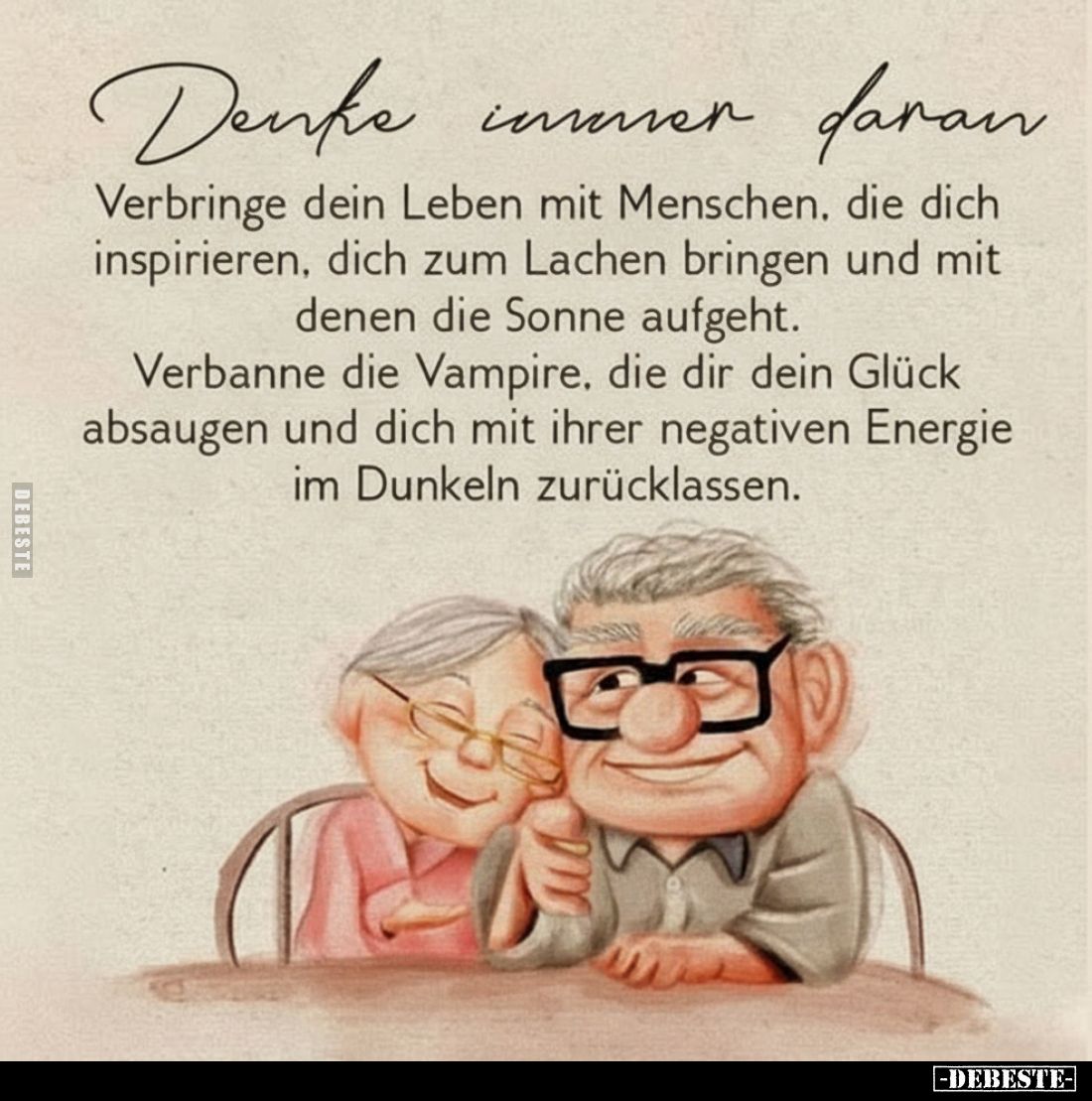 Denke immer daran - Verbringe dein Leben mit Menschen, die dich inspirieren, dich zum Lachen bringen und mit denen die Sonne aufgeht. Verbanne die Vampire, die dir dein Glück absaugen und dich mit ihrer negativen Energie im Dunkeln zurücklassen. Kommentar (0) | tags: